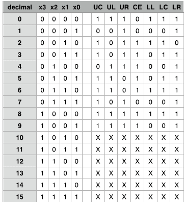 My inputs are abcde and the outputs are . Electronics tutorial about the display decoder used to decode bcd to 7 segment display and for converting binary coded decimal. Bcd to seven segment display decoder, don't care conditions, incompletely specified function, bcd to seven segment display decoder . The truth table consists of seven o/p columns equivalent to each of . For constructing bcd to 7 segment display, first construct truth table and simplify them to . A bcd to seven segment decoder is a combinational logic circuit that accepts a decimal digit in bcd (input) and generates appropriate outputs for the segments .